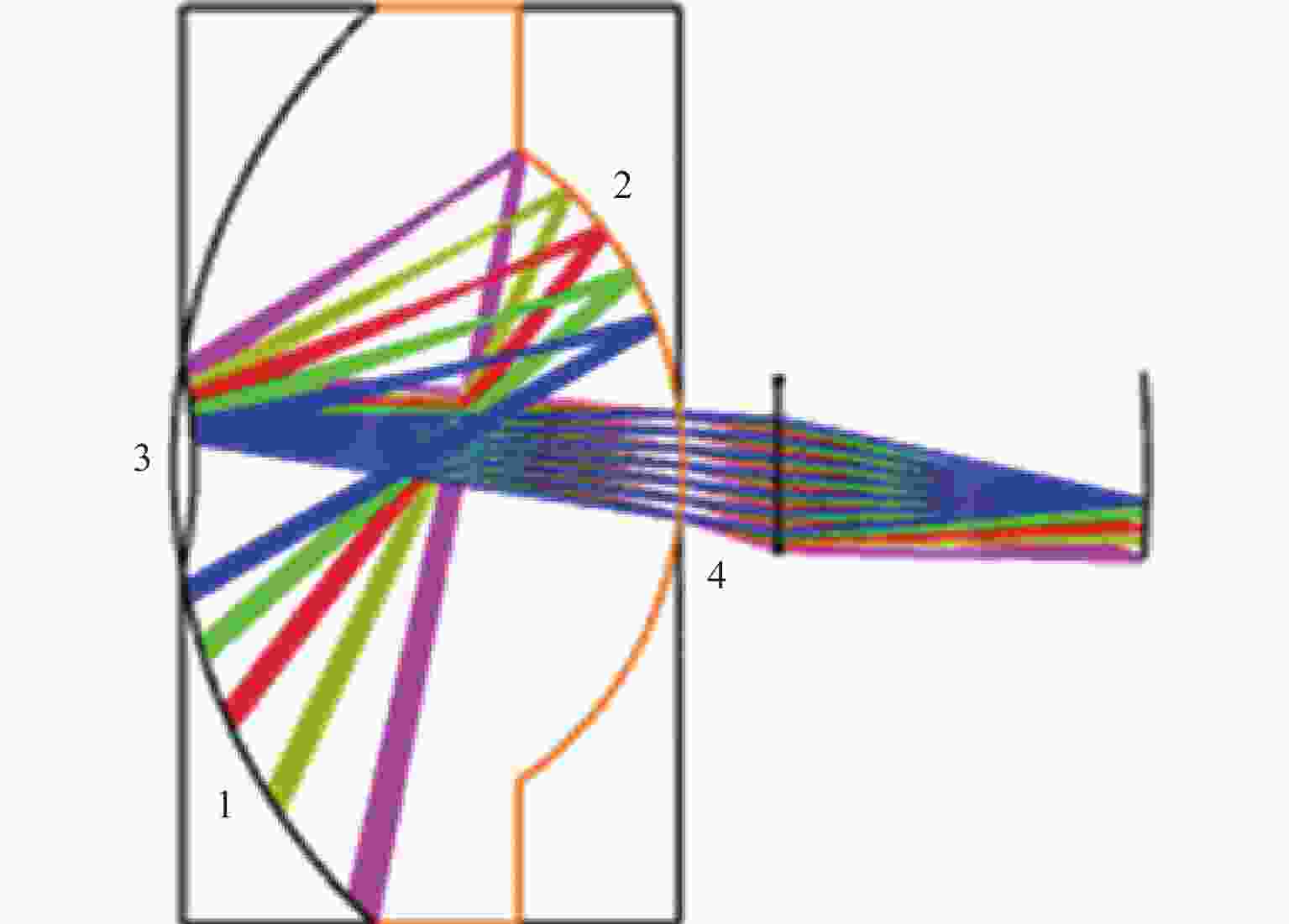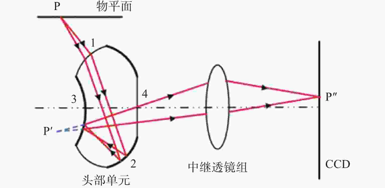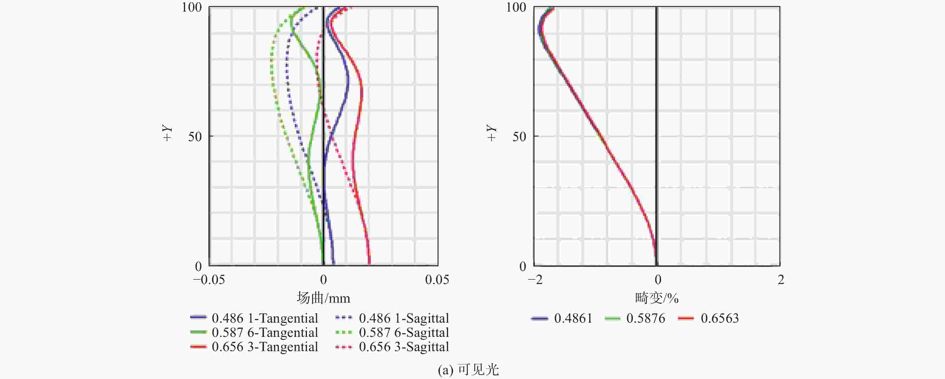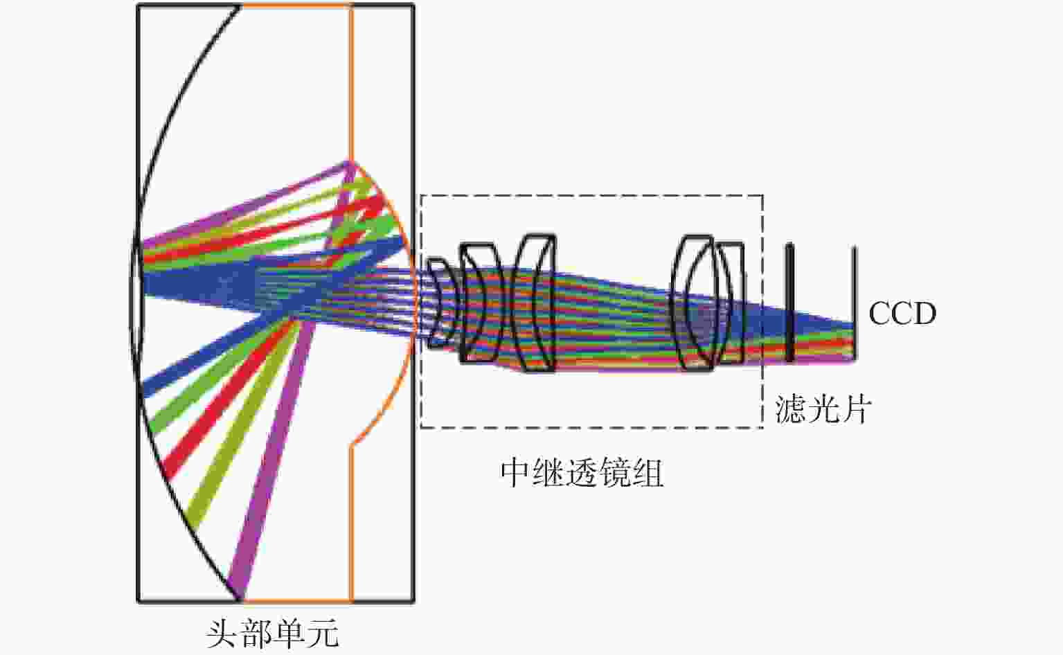 • 摘要: 设计了一款能实现全天候清晰成像的全景监控摄像光学系统。采用全景环带结构形式,该结构分为摄像头部单元和中继透镜单元两部分,摄像头部单元完成全视场目标搜索,中继透镜单元将头部单元所成的中间虚像进行二次成像会聚到探测器上。设计时采用多重结构优化方式,实现可见光及近红外双波段成像。该光学系统视场为360°×(40°~100°),焦距为−2.75 mm,F数为3.28。设计结果表明:系统的MTF(modulation transfer function)值在全视场处接近衍射极限,各个视场的弥散斑半径均小于所选CCD像元尺寸,畸变小于2 %,且日夜离焦量小于0.002 mm,该设计结果可满足全天候全景监控需求。