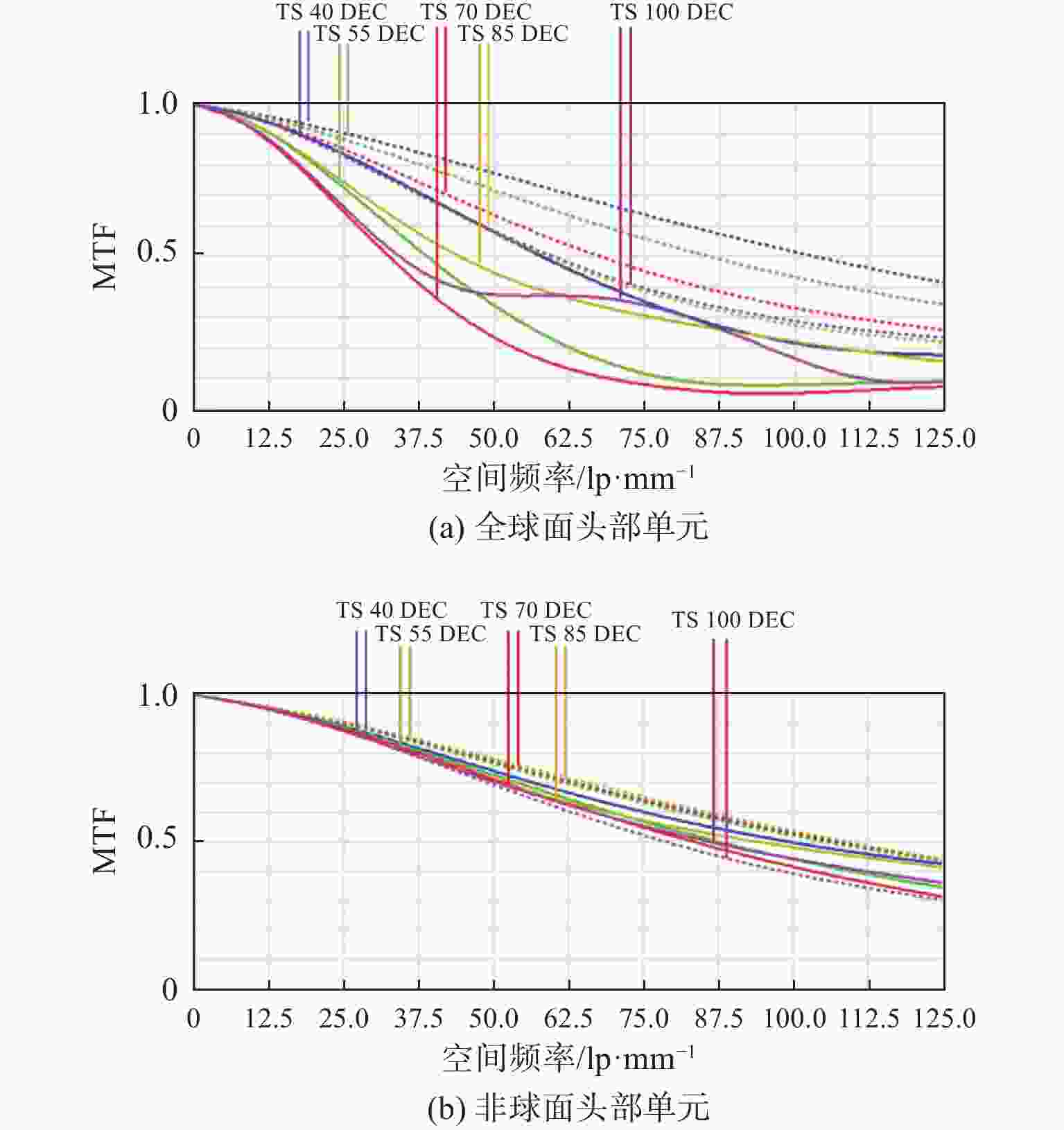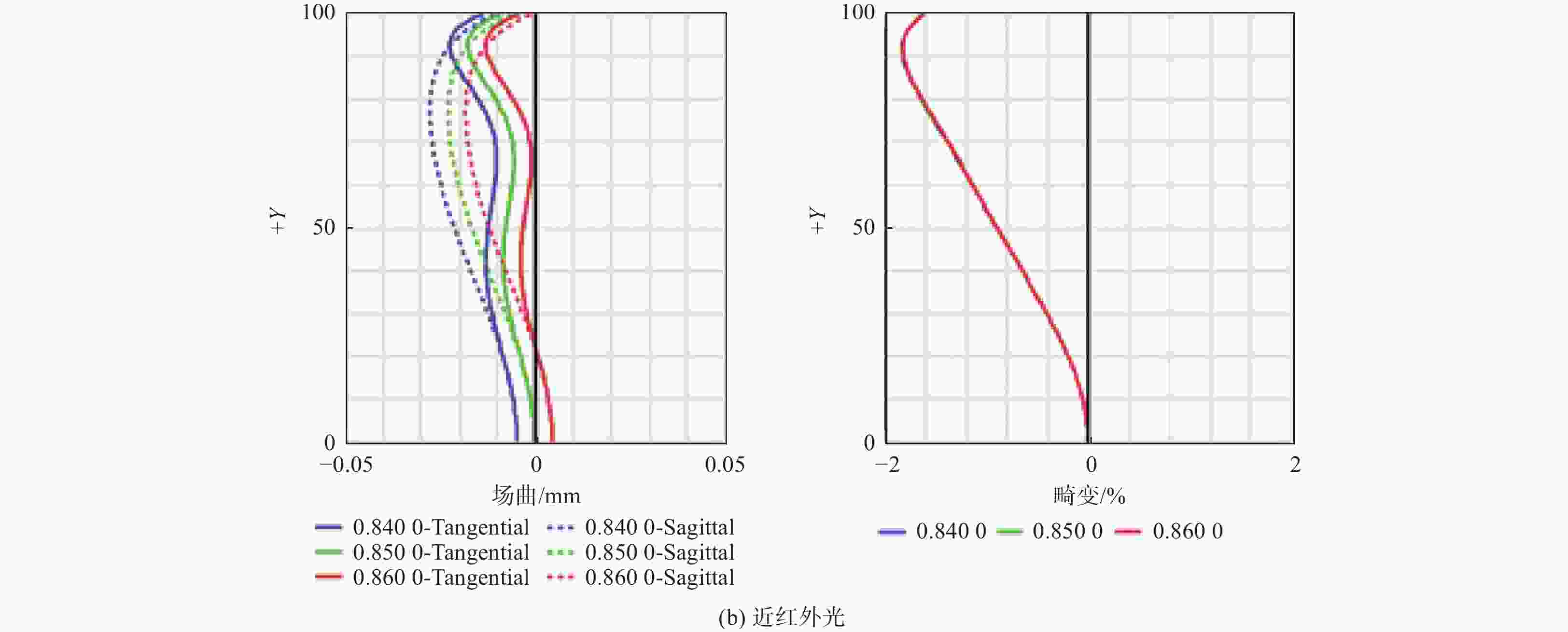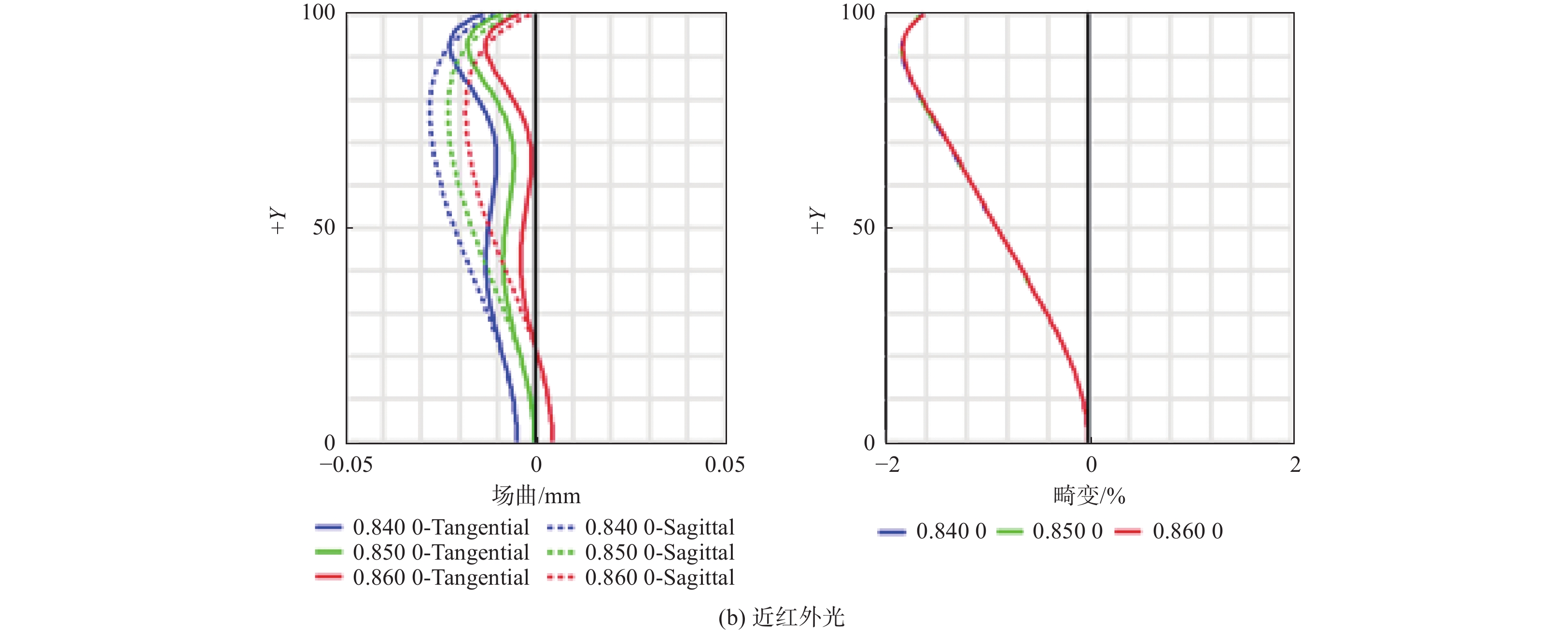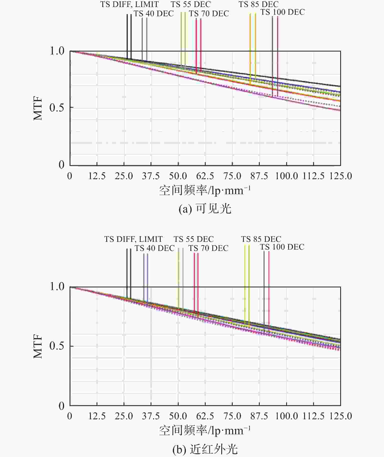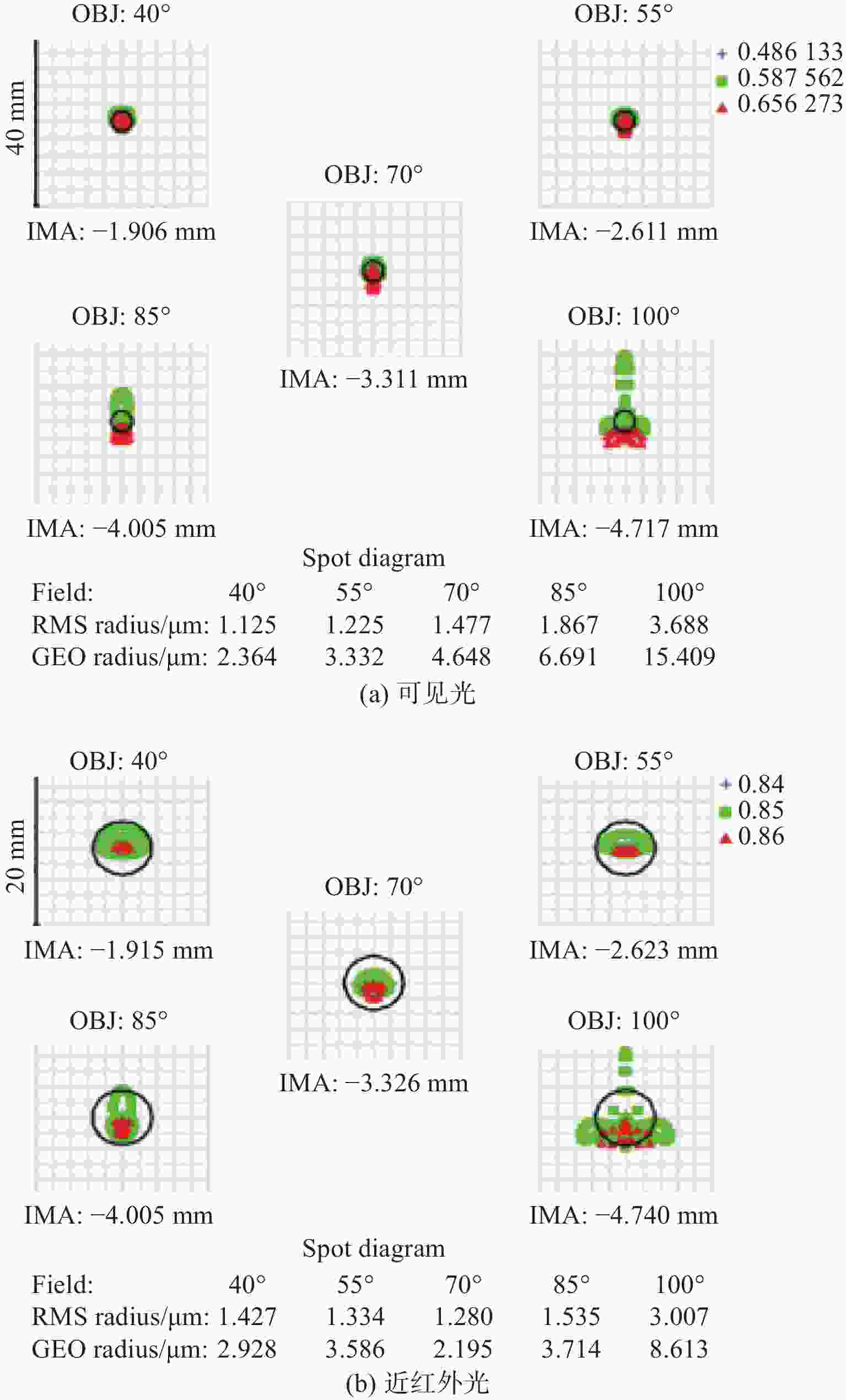 Abstract: An optical system for panoramic surveillance cameras that can achieve clear all-weather imaging was designed. A panoramic annular structure was adopted, which was divided into two parts: camera head unit and relay lens unit. The camera head unit completed the full field of view target search, and the relay lens unit performed secondary imaging of the intermediate virtual image formed by the head unit and converged it on the detector. The design adopted multiple structural optimization methods to achieve visible light and near-infrared dual band imaging. The field of view of the optical system is 360°× (40°~100°), the focal length is −2.75 mm, and the F number is 3.28. The design results show that the modulation transfer function (MTF) value is close to the diffraction limit at the full field of view, the diffuse spot radius of each field of view is less than the selected CCD pixel size, the distortion is less than 2%, and the day-night defocus amount is less than 0.002 mm, which can meet the requirements of all-weather and panoramic surveillance.