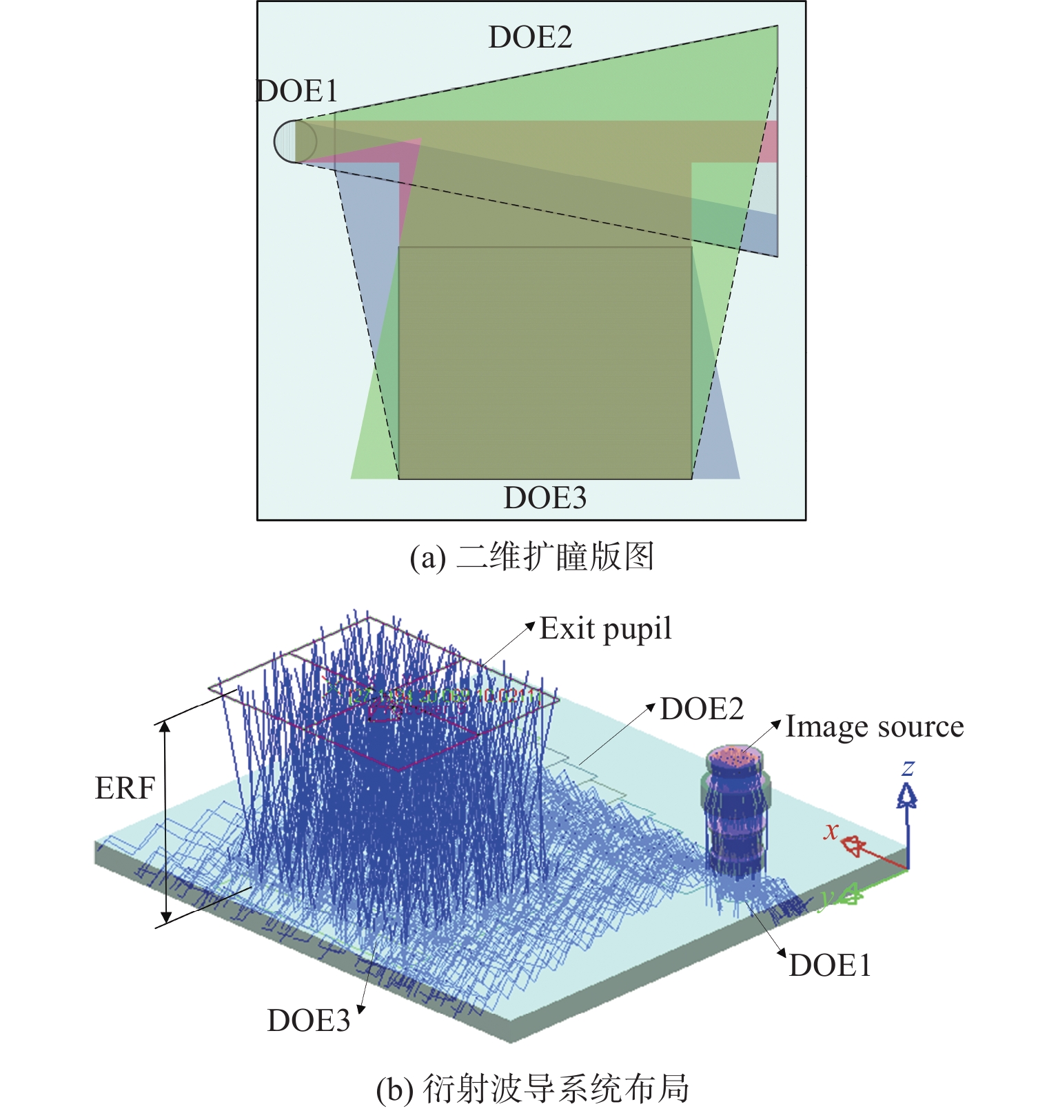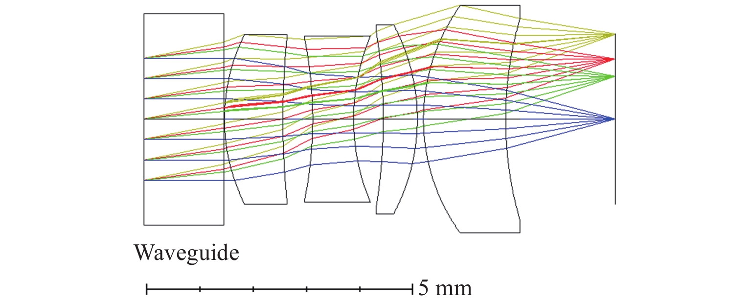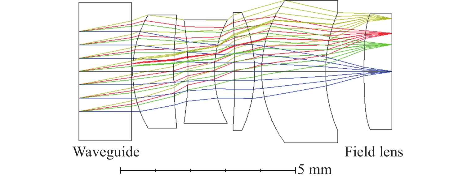 F#) of 1.87, and a modulation transfer function greater than 0.5 at 125 lp/mm. The simulation results show that the illumination uniformity is relatively improved by 14%, and the optical efficiency of the edge FOV is relatively increased by 15%. The lens has good imaging performance, and can be applied in the ultra-small AR diffraction grating waveguide head-mounted display system.